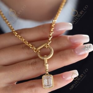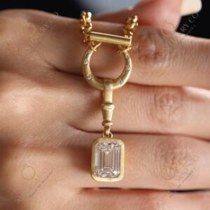Elegant Emerald Cut Diamond Pendant Necklace in Yellow Gold with Unique Toggle Clasp Detail Modern Fine Jewelry Piece for Women Perfect Blend of Classic and Contemporary Style