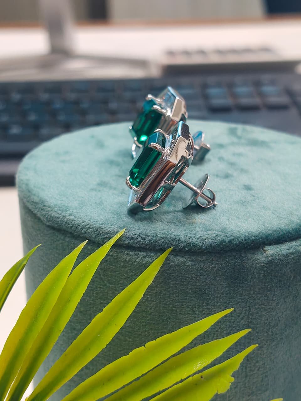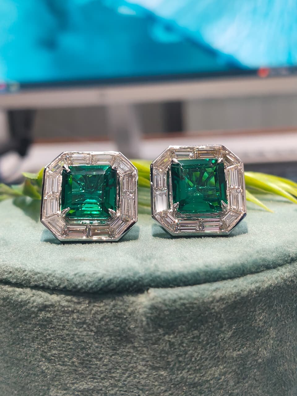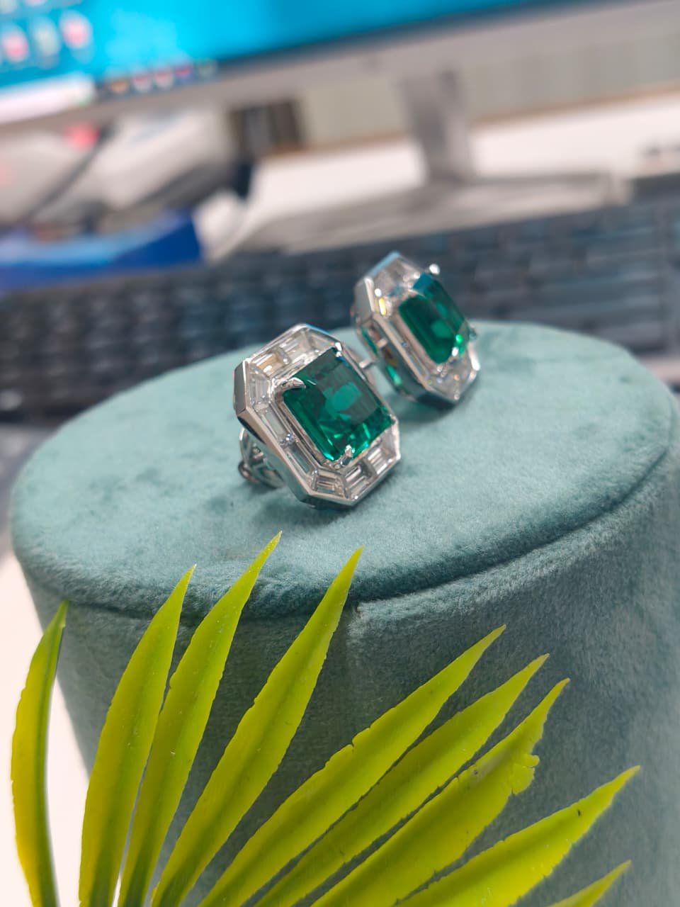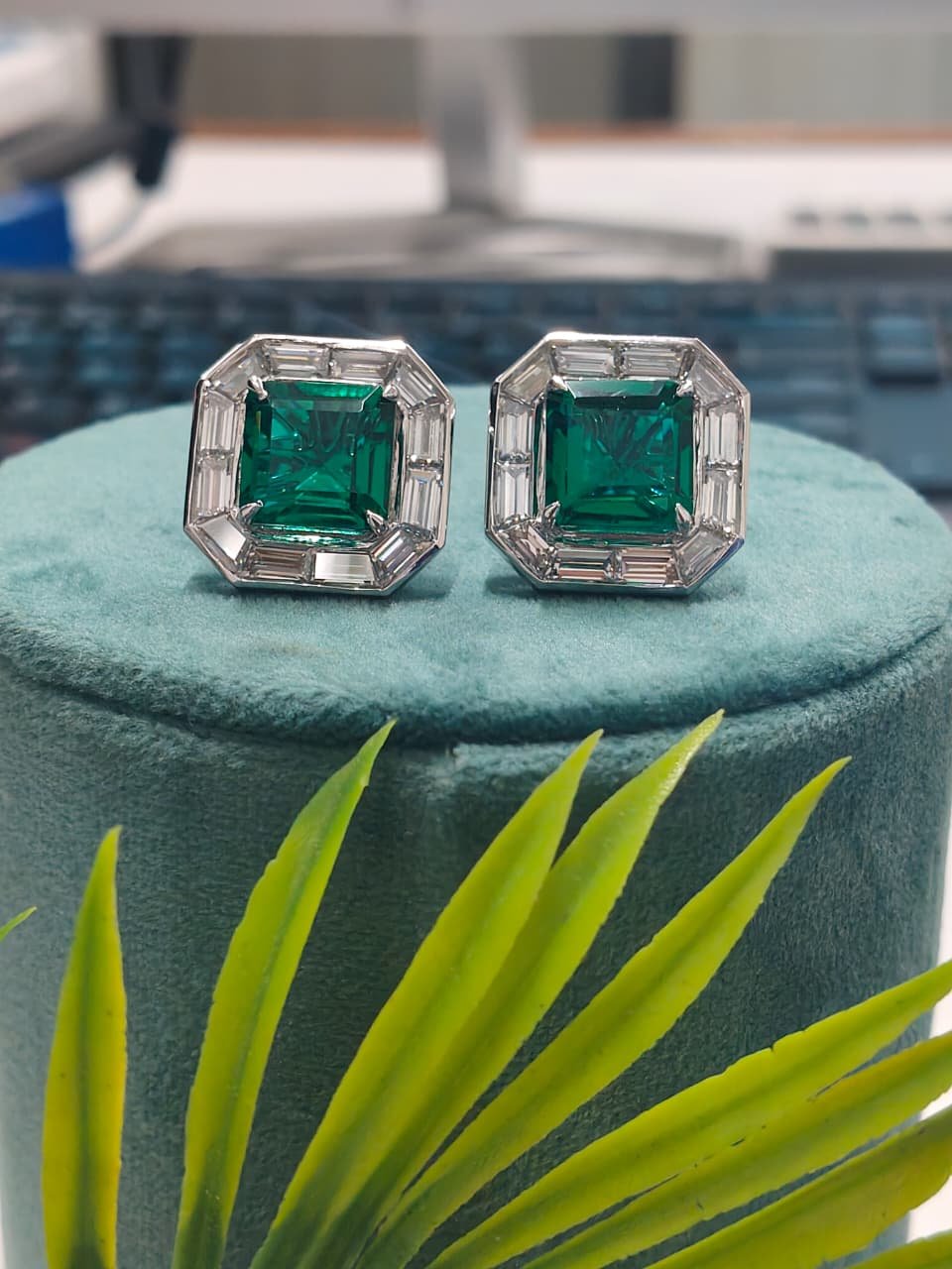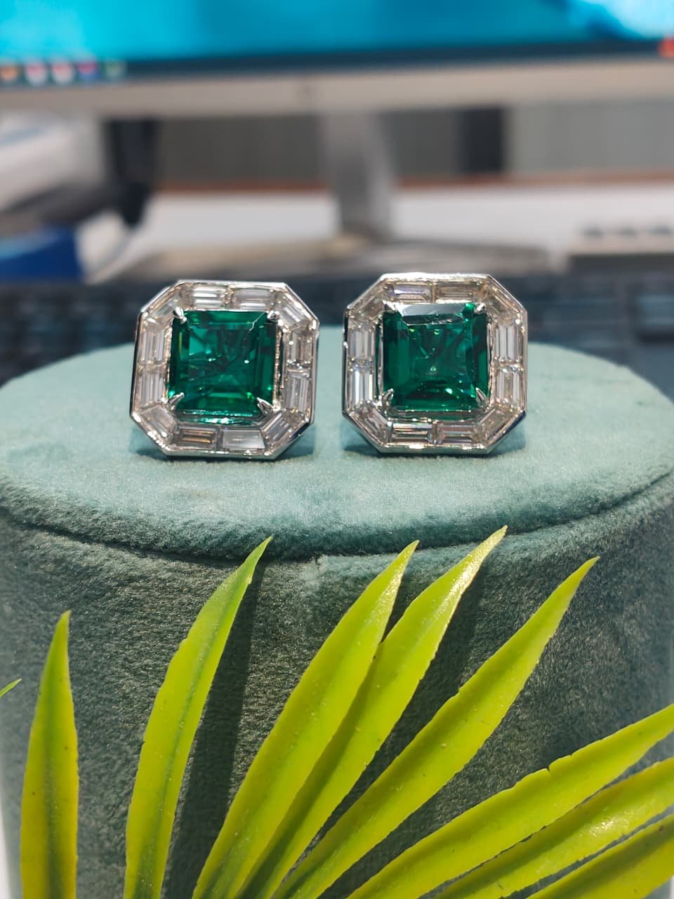 Be the first to review “Emerald Cut Green Stone Stud Earrings with Baguette Diamond Halo in 10K 14K 18K White Gold Luxury Octagon Designer Jewelry For Engagement”