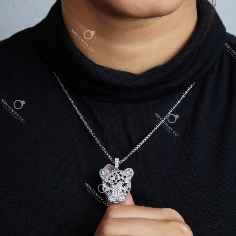 Be the first to review “Iced Out Leopard Head Hip Hop Pendant in White Gold with Black and White Diamonds Luxury Statement Chain Necklace for Men”