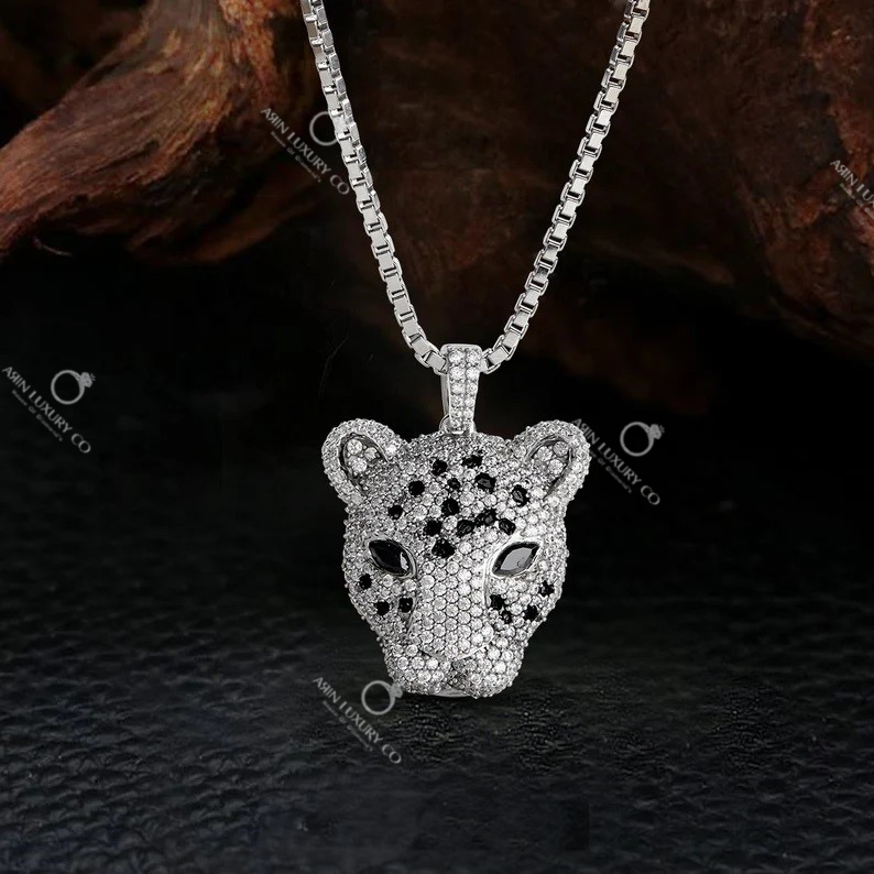Iced Out Leopard Head Hip Hop Pendant in White Gold with Black and White Diamonds Luxury Statement Chain Necklace for Men