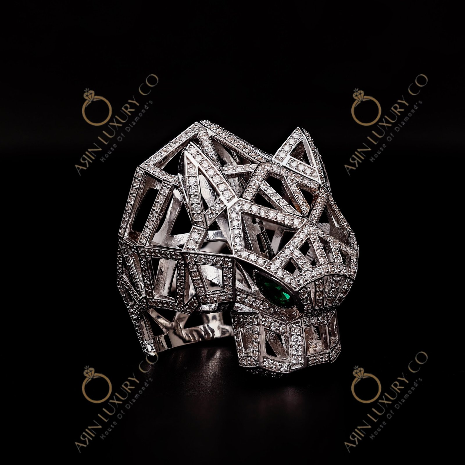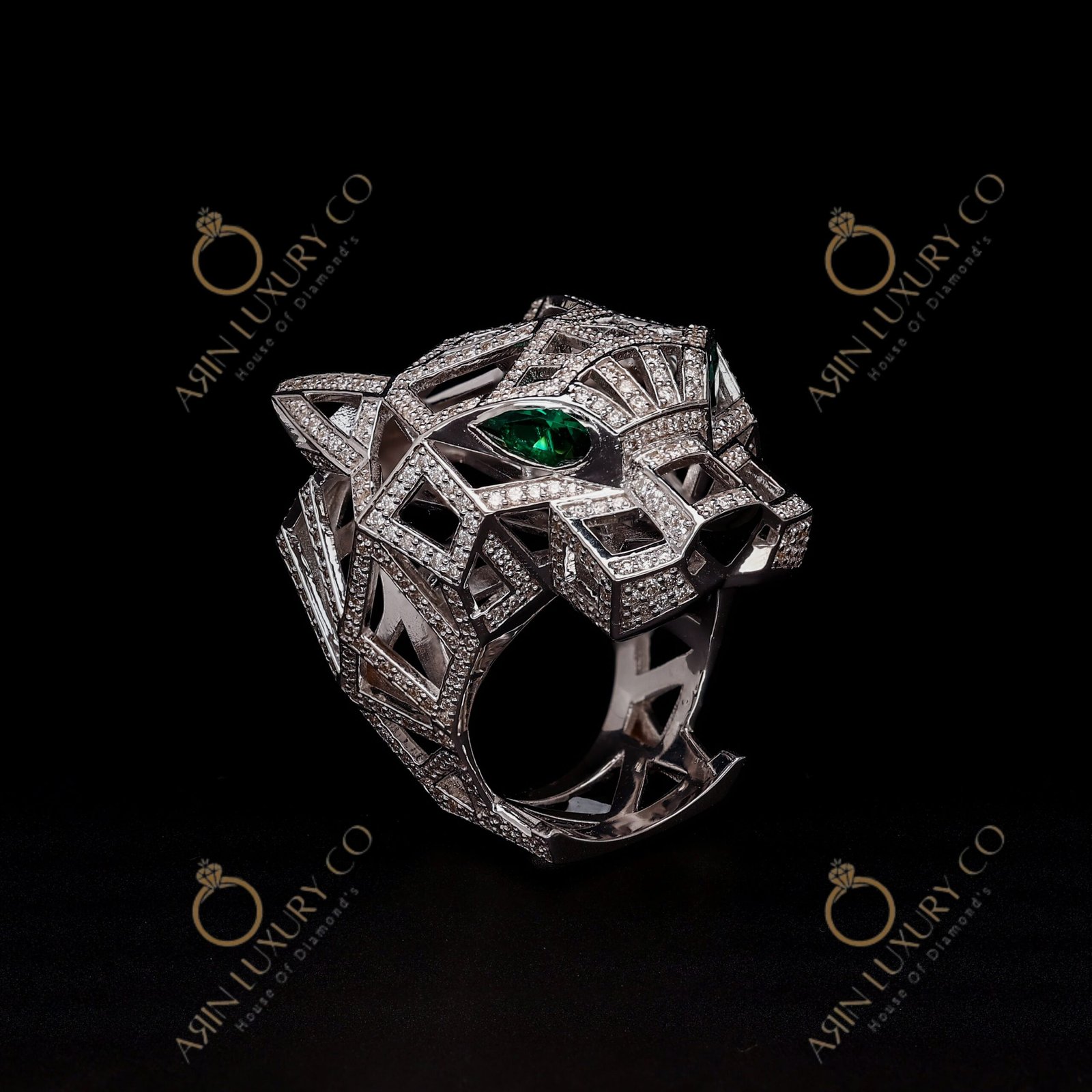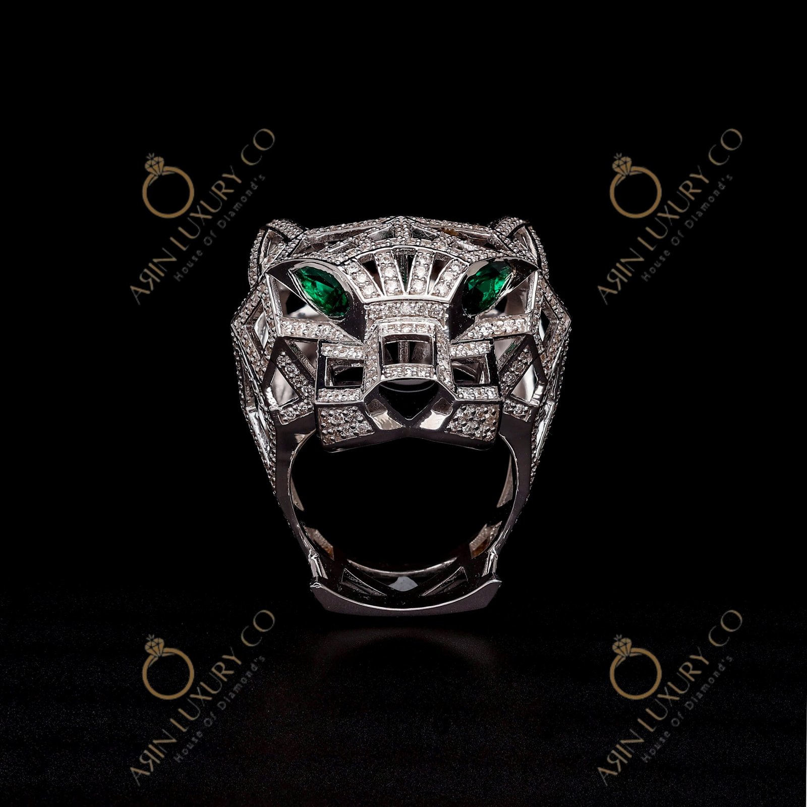 Luxury Panther Face Diamond Ring in White Gold with Green Stone Eyes Bold Animal Design Statement Ring for Men Premium Hip Hop Jewelry