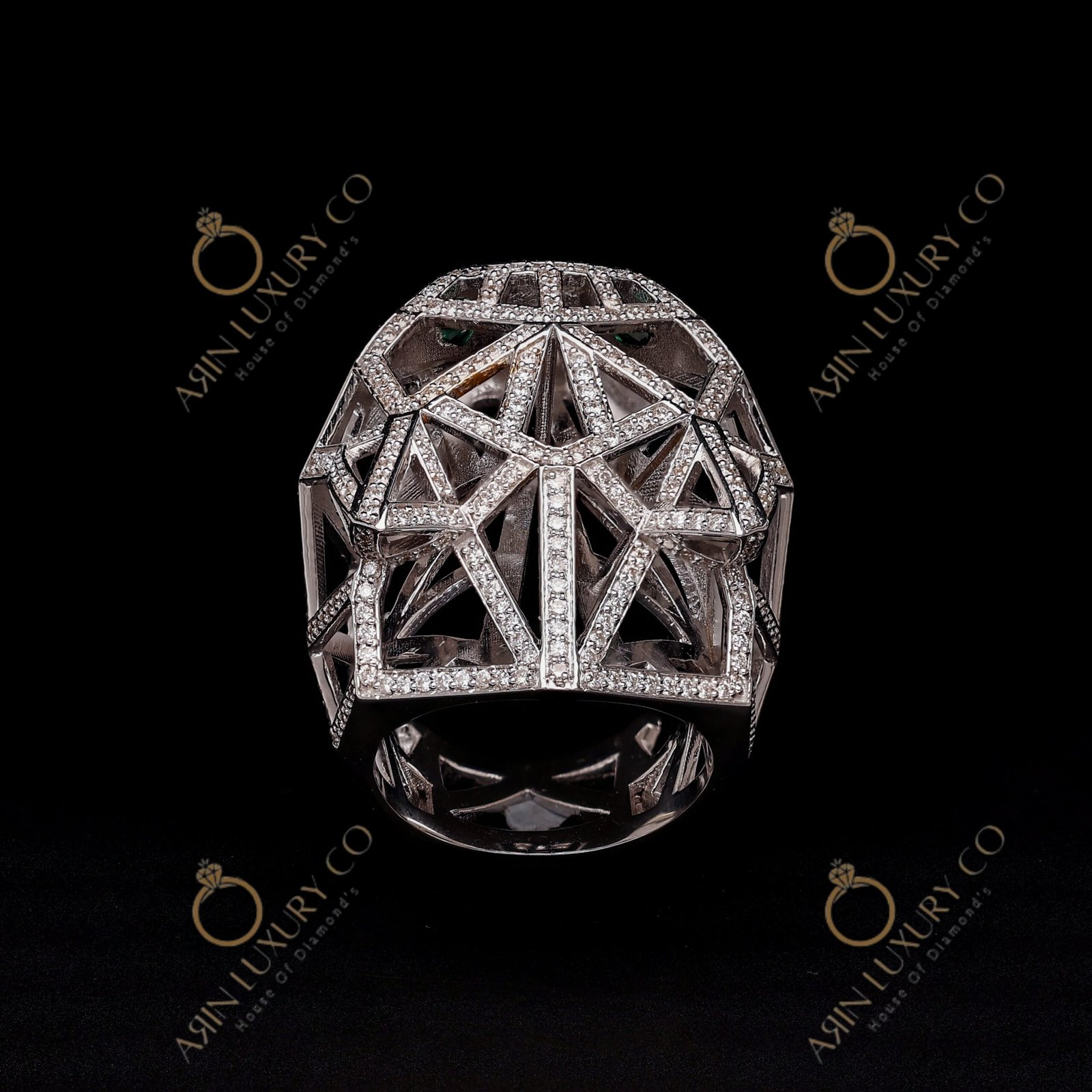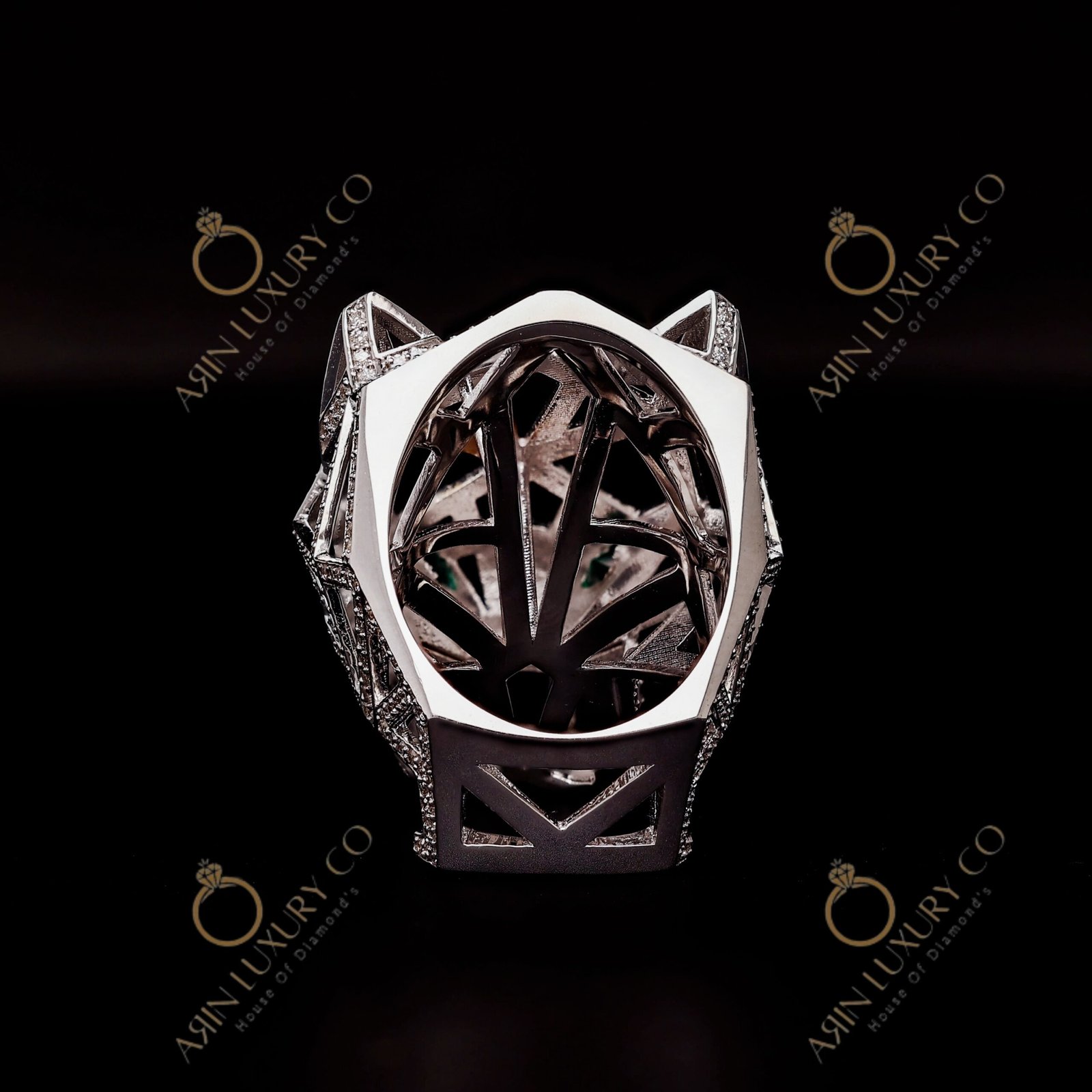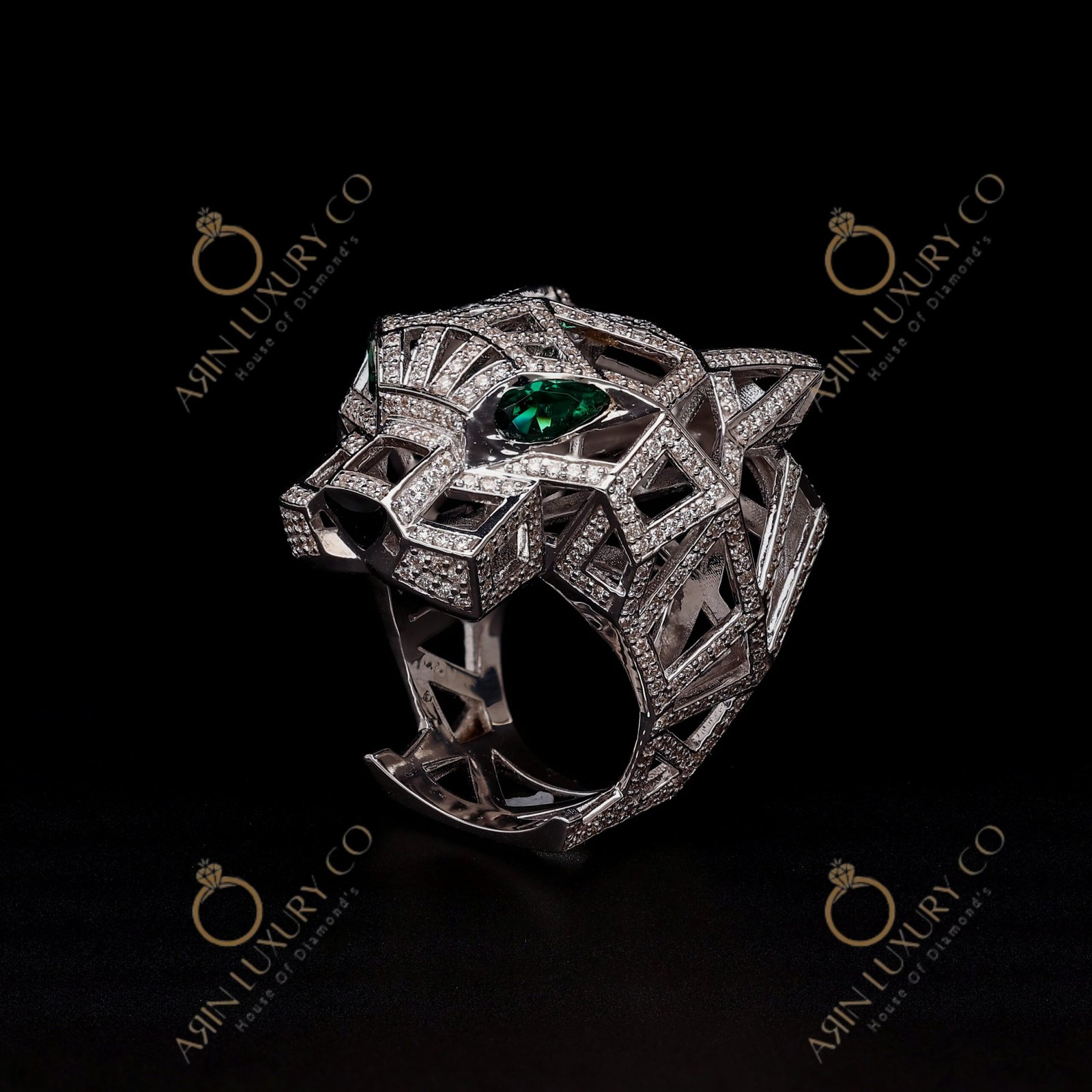 Luxury Panther Face Diamond Ring in White Gold with Green Stone Eyes Bold Animal Design Statement Ring for Men Premium Hip Hop Jewelry