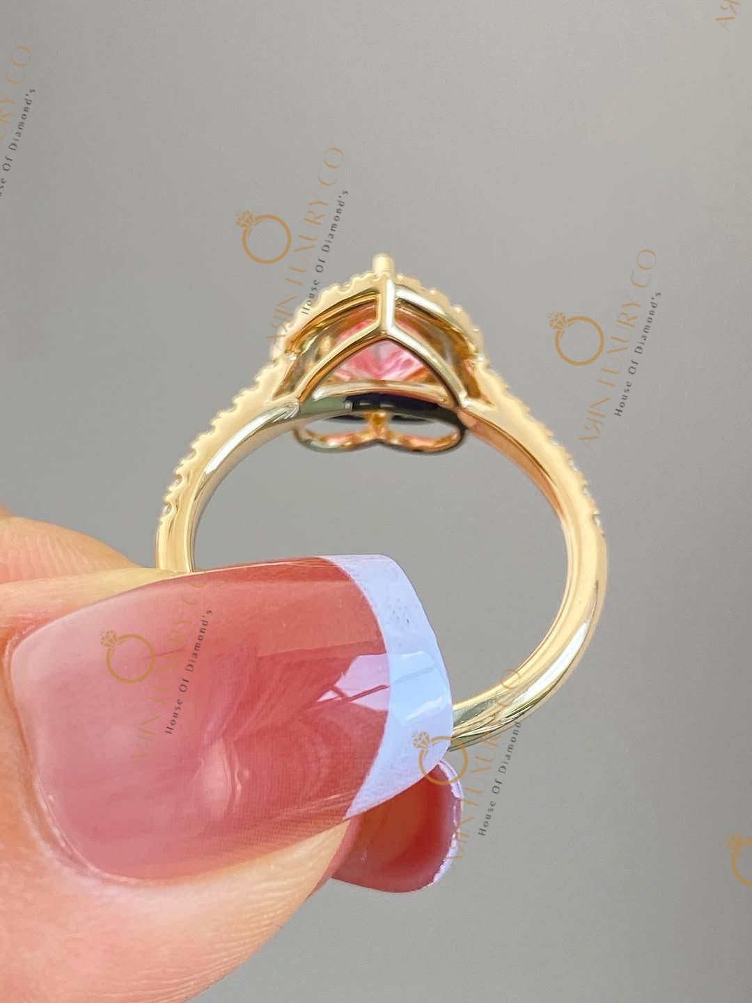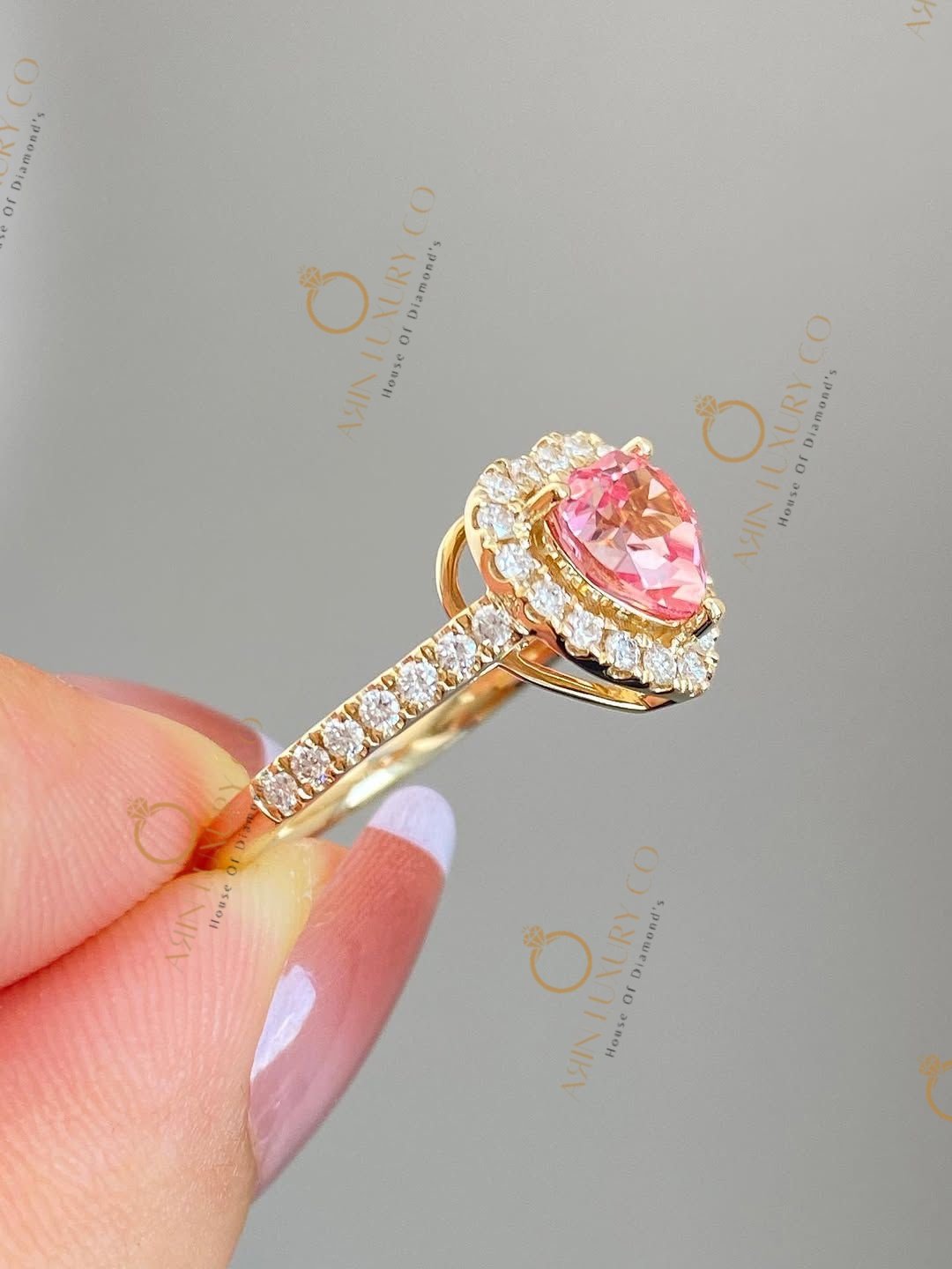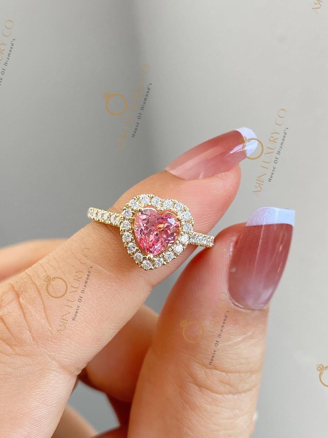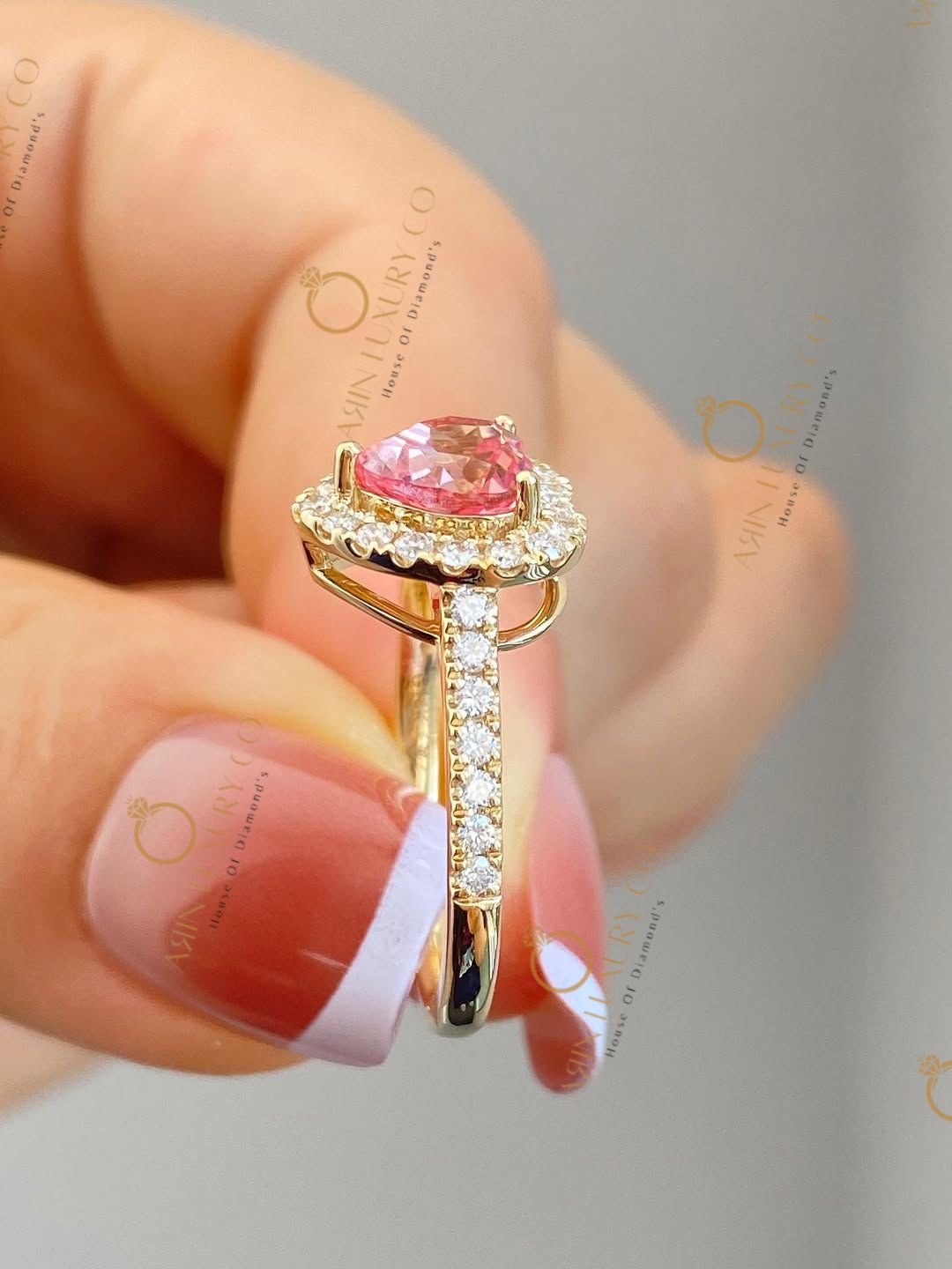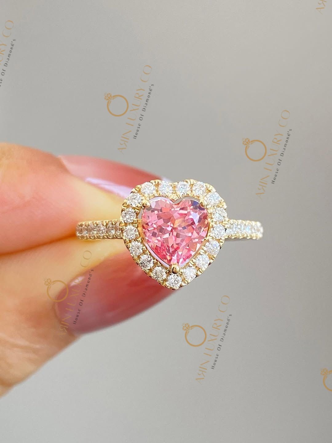 Romantic Pink Heart Cut Diamond Engagement Ring | 10K 14K 18K Gold Heart Halo Solitaire | Pave Diamond Band Bridal Ring | Arin Luxury Co. Designs
