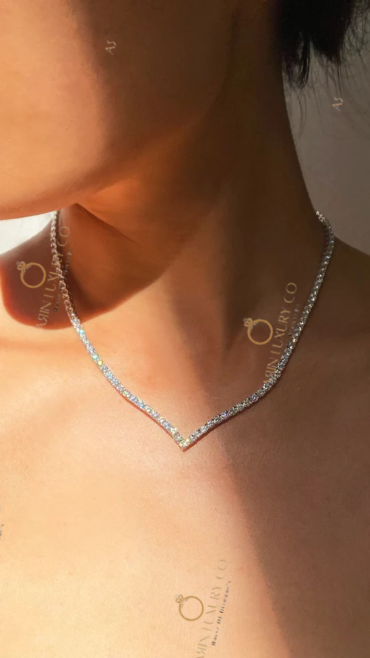 Round Cut Diamond V Shape Tennis Necklace in Solid White Gold Elegant Sparkling Chain Necklace Luxury Bridal Wedding Jewelry Anniversary Birthday Gift for Her