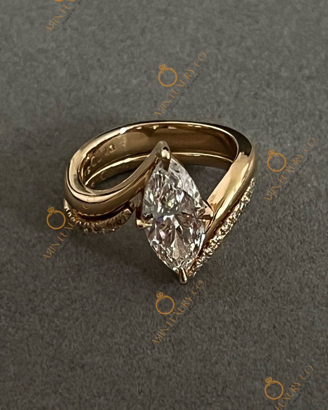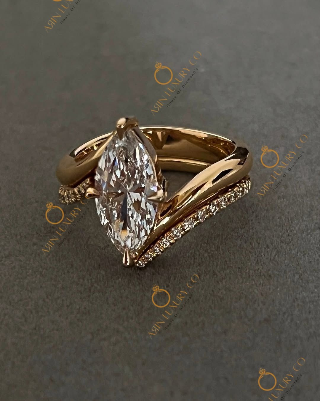 Stunning Marquise Solitaire with Contoured Diamond Guard In 10K 14K 18K | Gold Bypass Bridal Set | Marquise Diamond Nesting Ring | Arin Luxury Designs