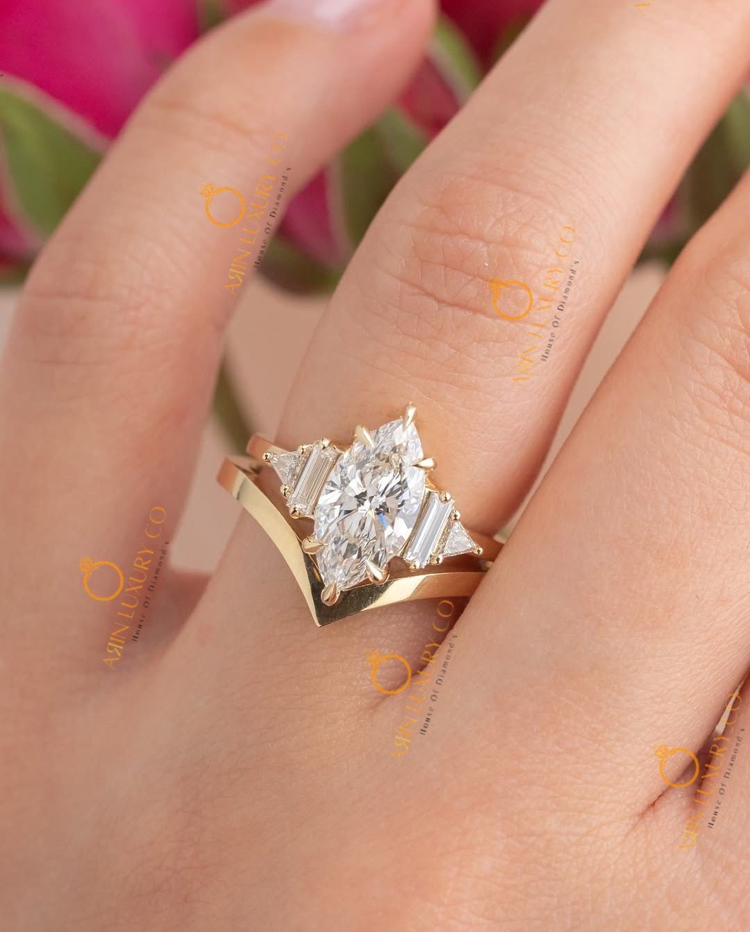 Unique Marquise Cut Five Stone Engagement Ring with Chevron Nesting Band In 10K 14K 18K | Baguette and Trillion Side Stone Bridal Set | Arin Luxury Co.
